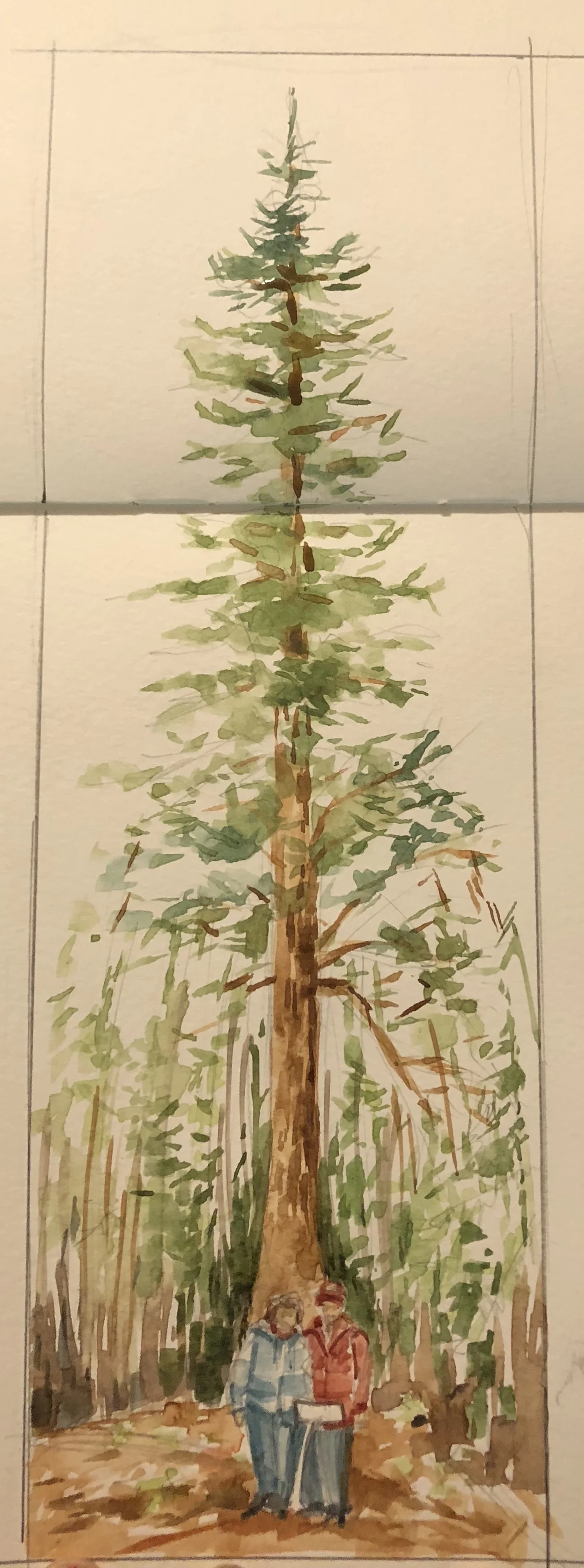 We had the unique idea of painting Donna’s tree so it stood alone on the canvas, having her grandparents at the bottom of the painting, and the tree shrouded in the Oregon mist at the top. Dims would be 12x48”.